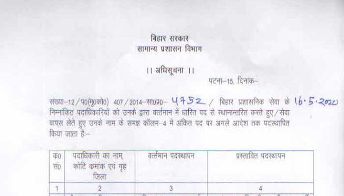 14. पदस्थापना की प्रतीक्षा में चल रहे अन्नू कुमार को बिहार राज्य पथ परिवहन निगम में प्रशासन मुख्य बनाया गया है. आपको बता दें कि अन्नू कुमार नवादा के एसडीओ थे. लेकिन बीजेपी विधायक को कोटा से बेटी को लाने के लिए पास बनाने पर सस्पेंड किया गया था. बाद में निलंबन वापस ले लिया गया था