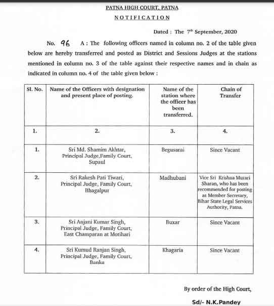 9. अंजनी कुमार सिंह को बक्सर का जिला एवं सत्र न्यायधीश बनाया गया है. मोतिहारी में फैमिली कोर्ट के प्रधान न्यायाधीश थे