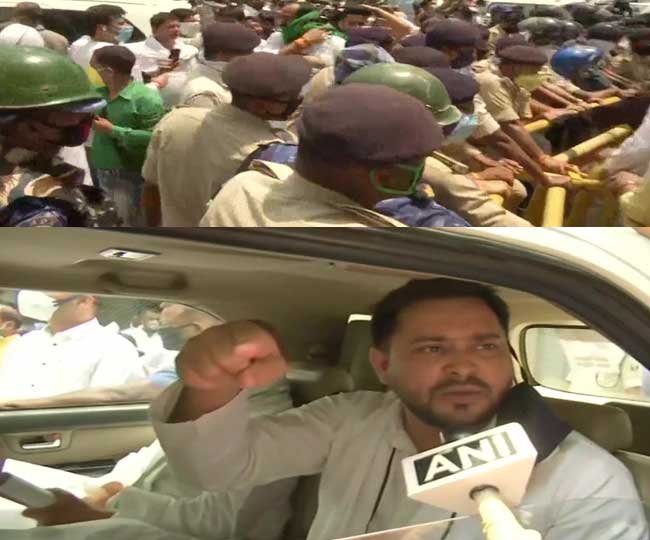 Patna: RJD leader Tejashwi Yadav has been stopped on his way to Goplaganj, amid the lockdown. He says, "They are not arresting criminals but they are stopping us from going to meet the victim's family (of Gopalganj firing incident)". #Bihar pic.twitter.com/F3lbvgDexS