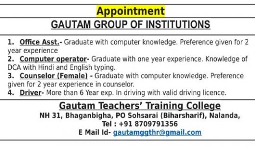 बिहारशरीफ के गौतम टीचर्स ट्रेनिंग कॉलेज ने अलग-अलग पदों के लिए वैकेंसी निकाली है। गौतम टीचर्स ट्रेनिंग कॉलेज को