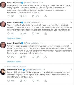 महबूबा मुफ्ती ने ट्वीट में लिखा कि ऐसे कठिन समय में, मैं अपने लोगों को यह विश्वास दिलाना चाहती हूं कि जो हो सकता है, हम इसमें एक साथ हों और इसका मुकाबला करेंगे. जो कुछ भी हमारा अधिकार है उसके प्रयास करने के लिए हमारे संकल्प को तोड़ा नहीं जा सकता. महबूबा मुफ्ती के इस ट्वीट को उमर अब्दुल्ला ने भी रिट्वीट किया है.