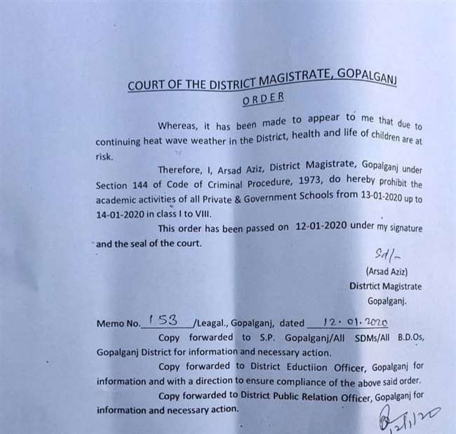 गोपालगंज में सर्दी और कनकनी को देखते हुए बच्चों की छुट्टी 12 जनवरी तक घोषित थी। अब इस छुट्टी को 14 जनवरी तक के लिए बढ़ा दी गई है, लेकिन जब डीएम कार्यालय से आदेश से संबंधित पत्र जारी हुआ तो हर कोई स्तब्ध रह गया।