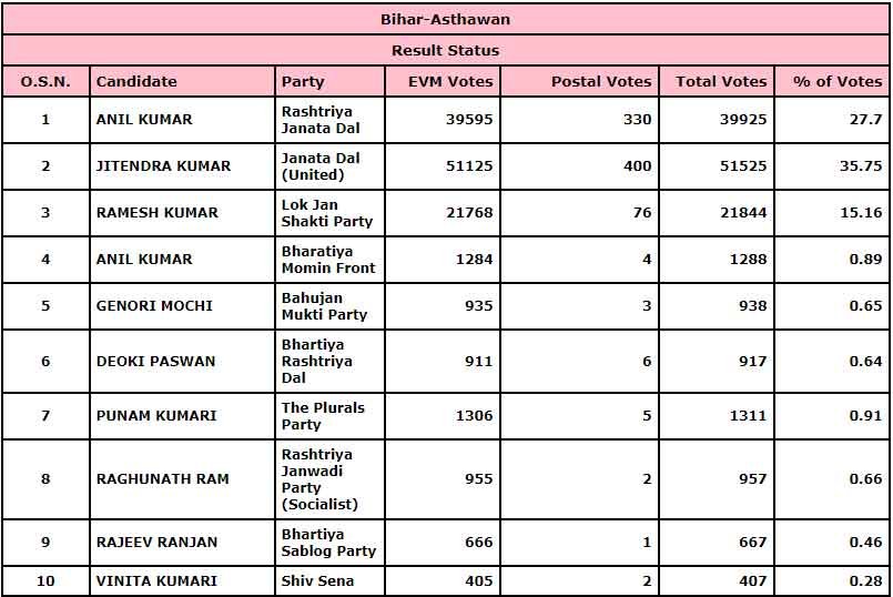 जेडीयू उम्मीदवार जितेंद्र कुमार को कुल 51 हजार 525 वोट मिले. जो कुल वोट का 35.75 प्रतिशत है. वहीं आरजेडी के अनिल कुमार को 39 हजार 925 वोट मिले जो कुल वोट का 27.8 फीसदी है.