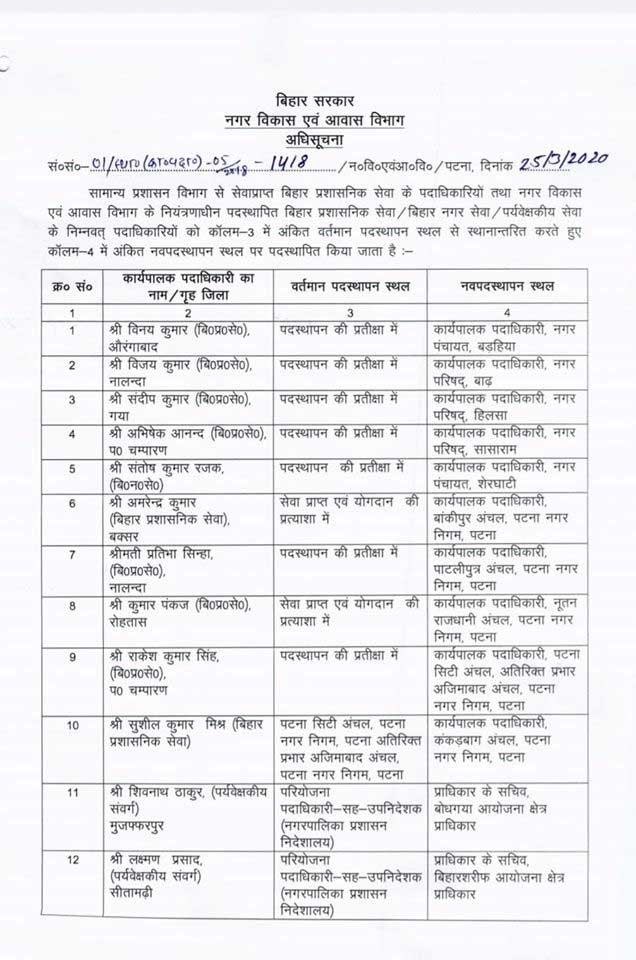 वहीं पदस्थापना की प्रतीक्षा में रहे बिहार प्रशासनिक सेवा के अधिकारी संदीप कुमार को डॉ प्रियंका गुप्ता की जगह हिलसा नगर परिषद का नया कार्यपालक पदाधिकारी बनाया गया है .