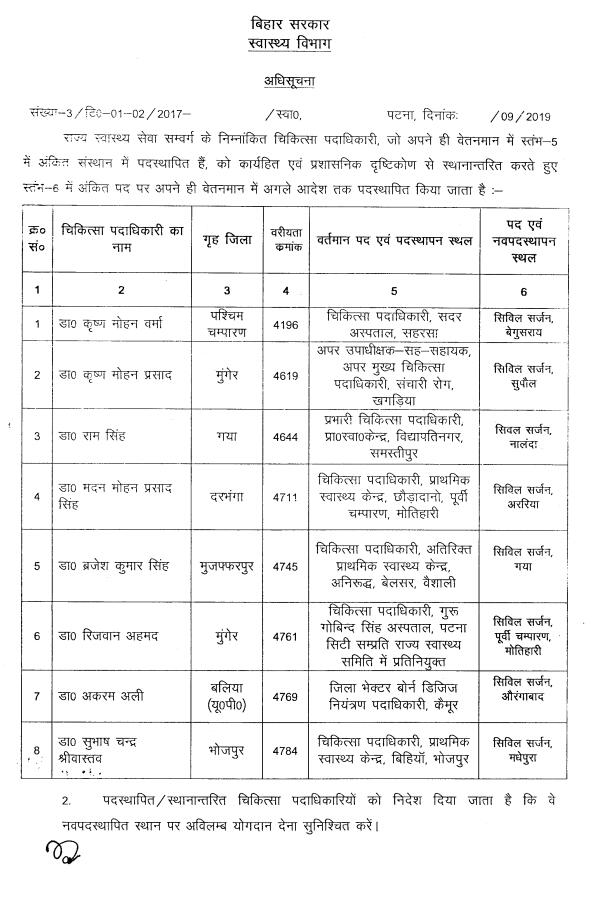 इसके अलावा डॉक्टर कृष्ण मोहन वर्मा को बेगूसराय का सिविल सर्जन बनाया गया । जबकि डॉ कृष्ण मोहन प्रसाद को सुपौल का सिविल सर्जन बनाया गया है । वहीं डॉ मदन मोहन प्रसाद सिंह को अररिया का सिविल सर्जन बनाया गया है ।जबकि डॉ.रिजवान अहमद को मोतिहारी के सिविल सर्जन की जिम्मेदारी सौंपी गई है । डॉ.अकरम अली को औरंगाबाद का सिविल सर्जन बनाया गया है । जबकि डॉक्टर सुभाष चंद्र श्रीवास्तव को मधेपुरा का सिविल सर्जन नियुक्त किया गया है ।